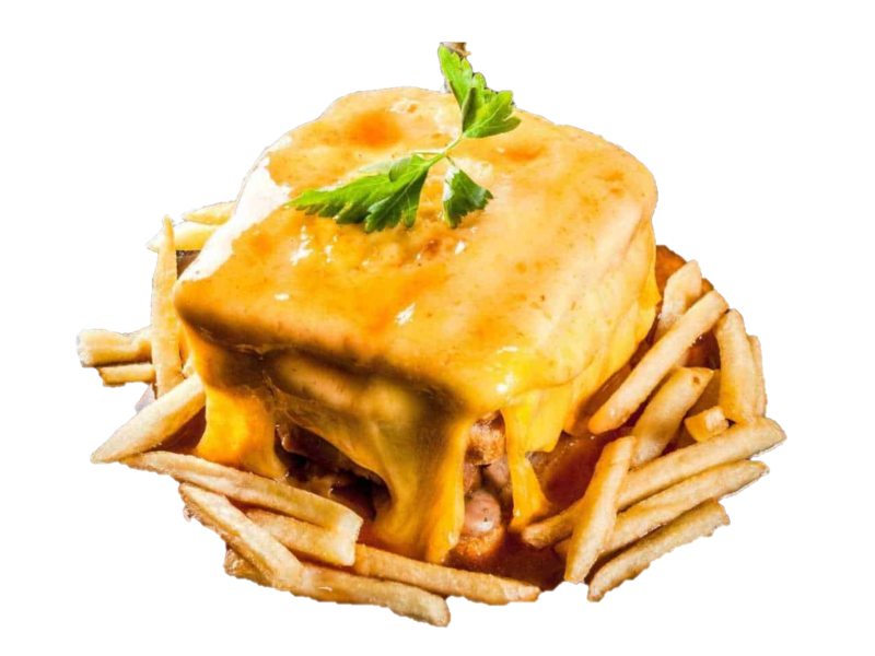 Francesinha the most decadent, flavoursome, and intense sandwich you will ever eat. The layers begin with a slice of bread, followed by ham, fresh sausage, steak, another slice of bread and to top it off a fried egg. But wait that’s not all, this sandwich is then covered in melted cheese and a hot thick sauce poured all over it creating a swimming pool for french fries around it.